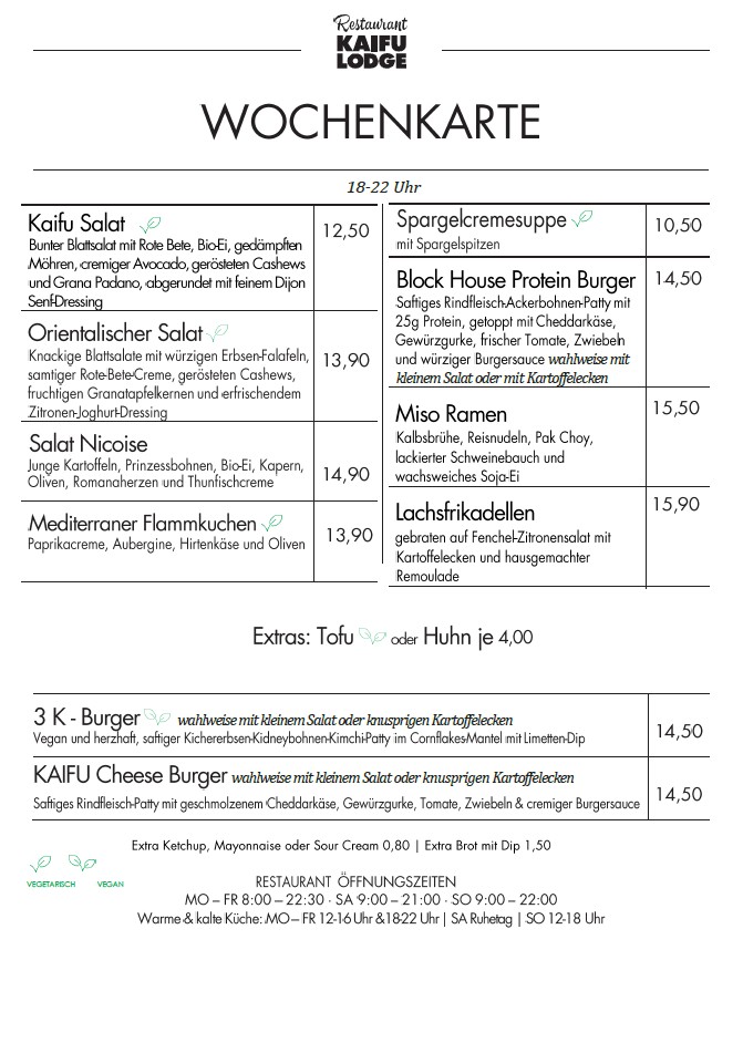 Hier findest Du unsere wechselnde Wochenkarte. Wir legen bei der Zubereitung unserer Speisen Wert auf Qualität und arbeiten nur mit ausgewählten Zutaten. Zudem haben wir immer eine vegetarische und eine vegane Option für Dich im Angebot.